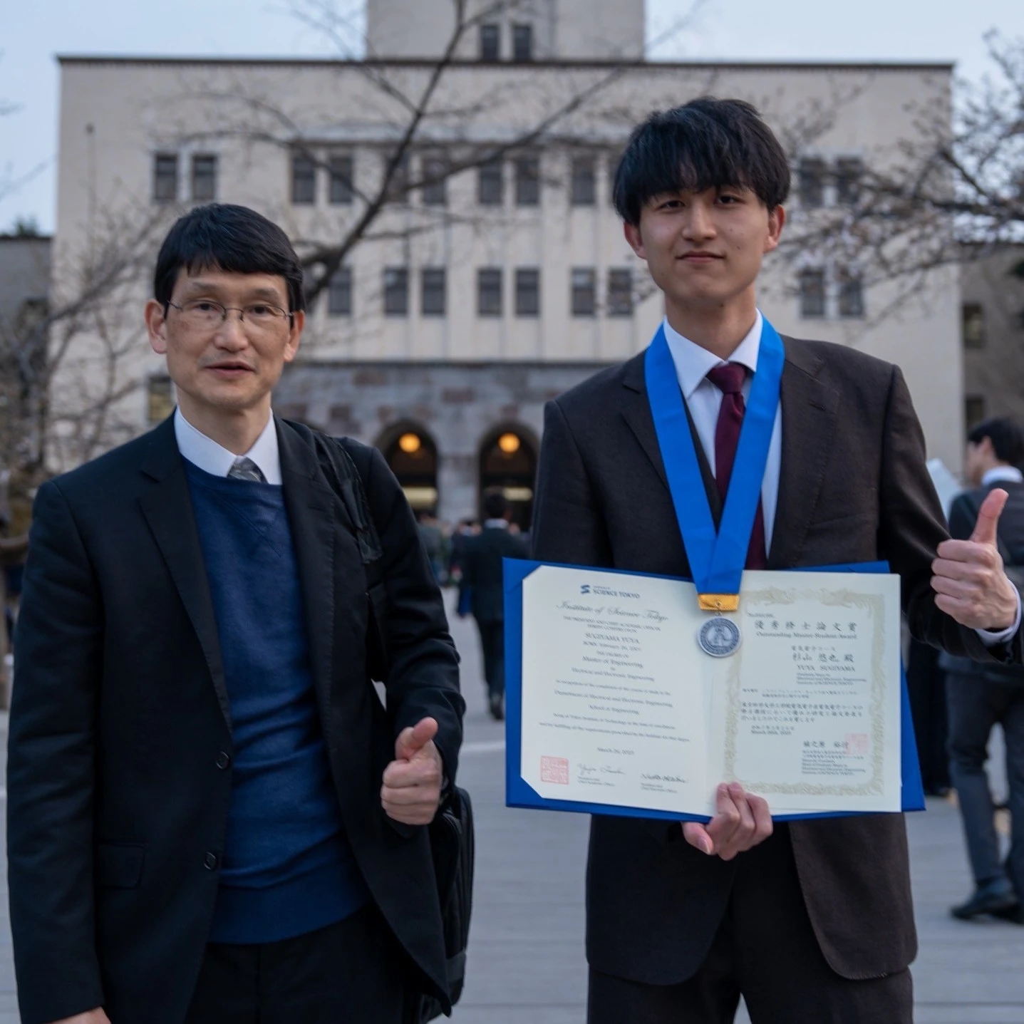 修士論文優秀賞をいただき、大変光栄に思います。この成果は,植之原裕行教授,相川洋平助教の丁寧なご指導、そして家族の支えがあってこそ得られたものであり、心より感謝申し上げます。 修了後は博士課程に進学し,光スイッチの実用化に向けた残る課題に引き続き取り組んでいきます。自由で恵まれた環境の中で研究に専念できることに感謝しながら,今後も成果を発展させ,社会に貢献できるよう努力してまいります。