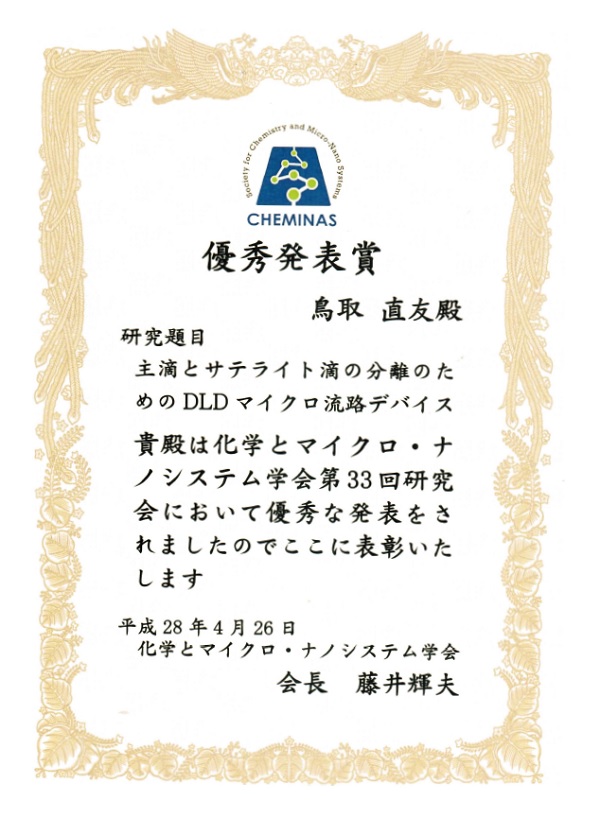 トップ > 最新情報 > 初澤・栁田研究室 鳥取直友〔D1〕が,化学とマイクロ・ナノシステム学会より「優秀発表賞」を受賞 (2016年4月26日)
