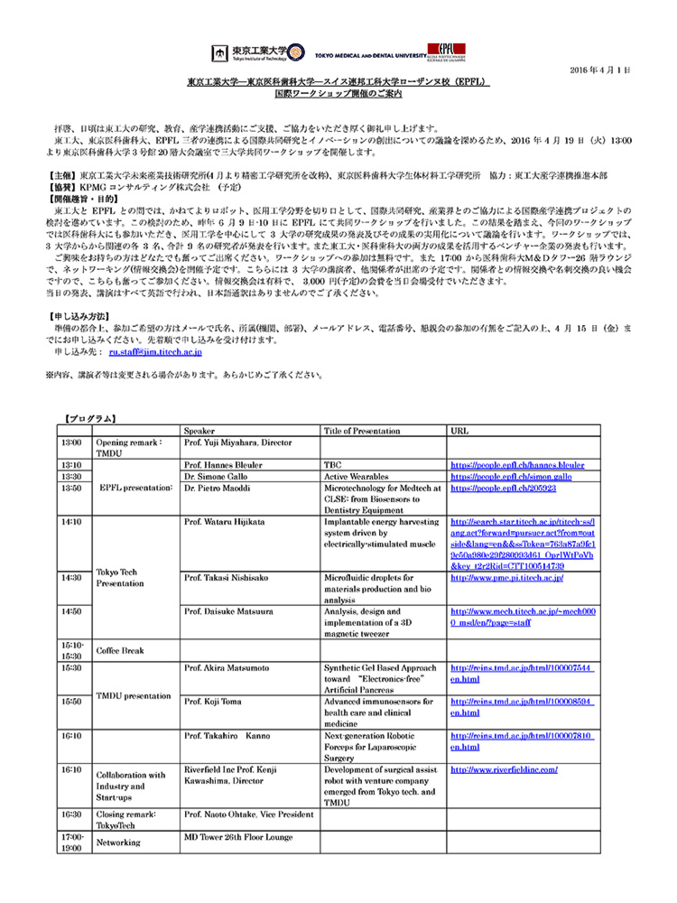 トップ > 最新情報 > 東工大・東京医科歯科大・EPFL国際ワークショップ開催(2016年4月19日)