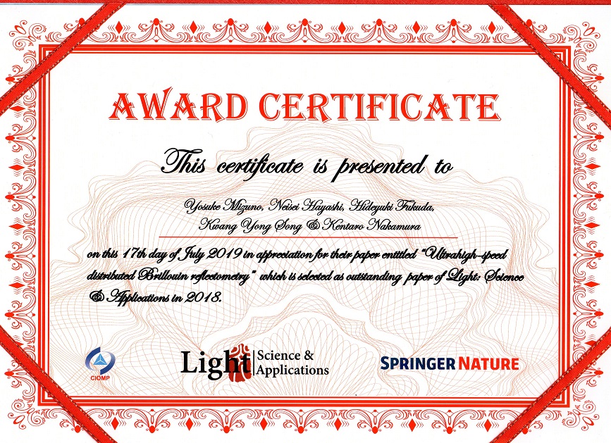| 受賞論文 | Ultrahigh-speed distributed Brillouin reflectometry(Light: Science & Applications, vol. 5, e16184(2016)) |