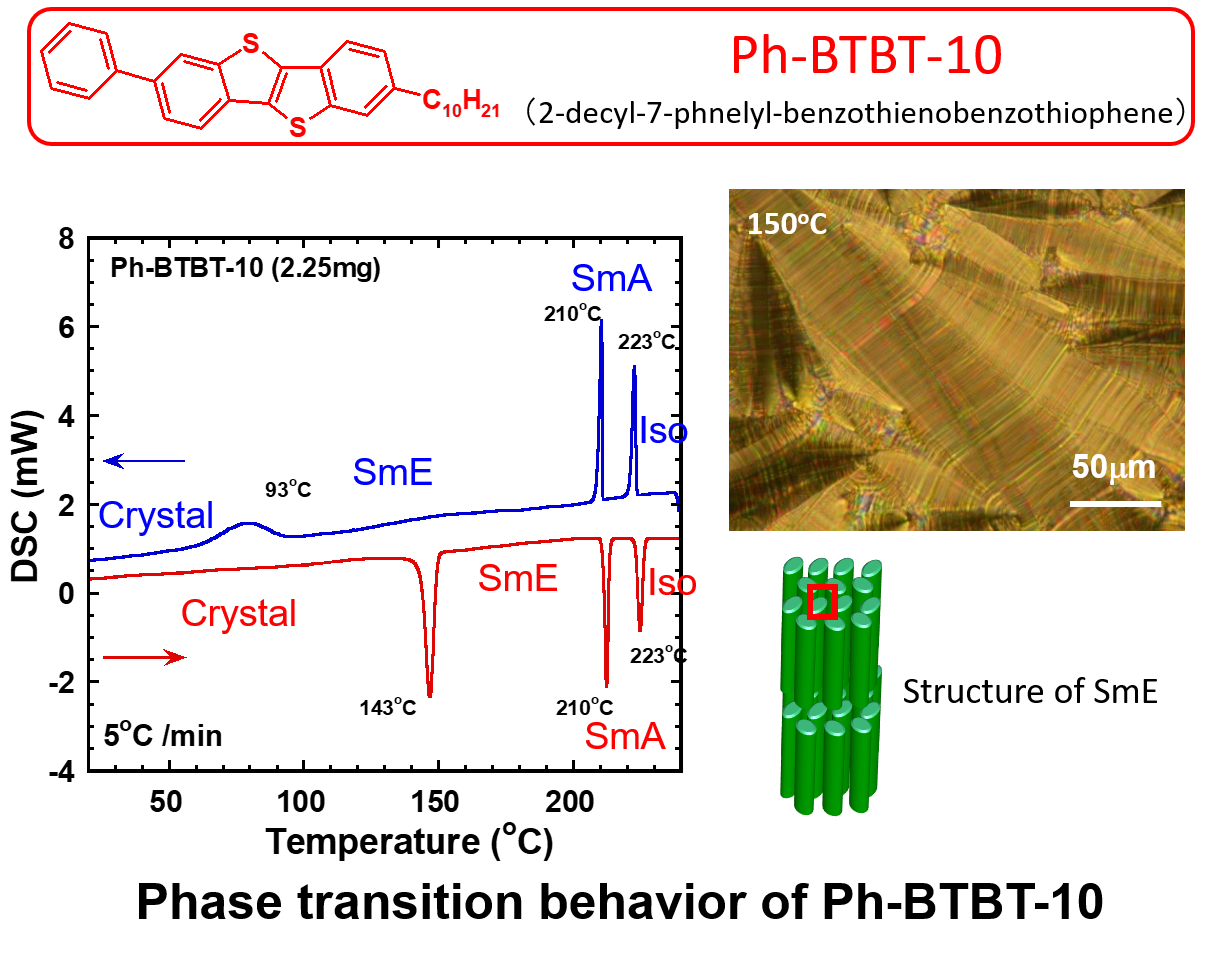 As a material that exhibits this liquid crystalline phase (SmE phase), we developed a liquid crystalline phenyl-benzothienobenzothiophene derivative (Ph-BTBT-10) in 2011. This material exhibits the SmE phase at temperatures from 142 °C to 210 °C, and because of its asymmetric structure, the supercooled liquid crystal phase until near room temperature. The asymmetric structure of the molecule allows the supercooled liquid crystal phase to continue until near room temperature, which makes it easy to fabricate thin films using the liquid crystal properties, and once crystallized, the crystal thin films are stable up to 142°C. Ph-BTBT-10 has high solubility in common organic solvents such as toluene, and has good thin film fabrication processability. Furthermore, polycrystalline thin films prepared by conventional solution processes show high mobility (5 cm2/Vs) and are attracting attention as a new organic semiconductor material.