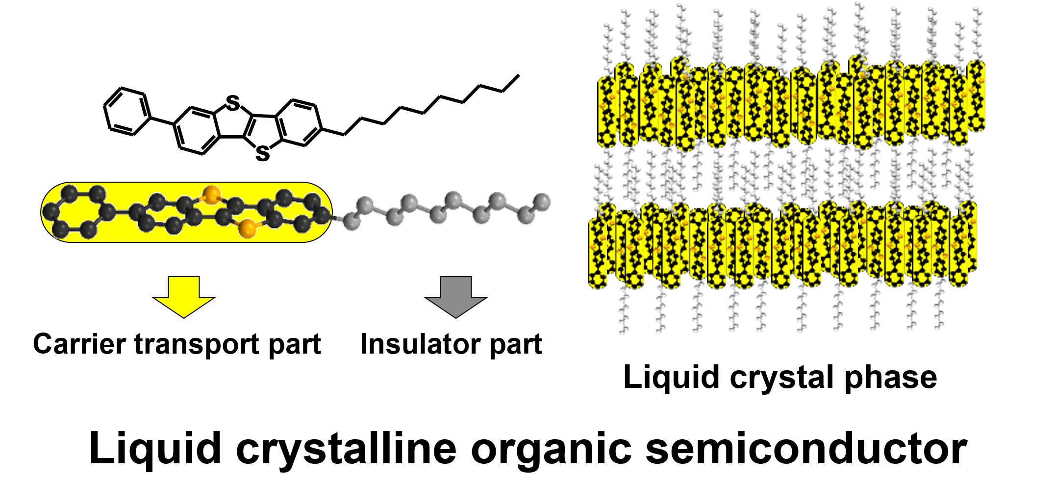 液晶性有機半導体の分子構造は、剛直な芳香族環に柔軟な炭化水素鎖を付与した分子で、棒状の液晶性有機半導体では、レイヤー構造を有する液晶相(スメクチック液晶相)を発現します。