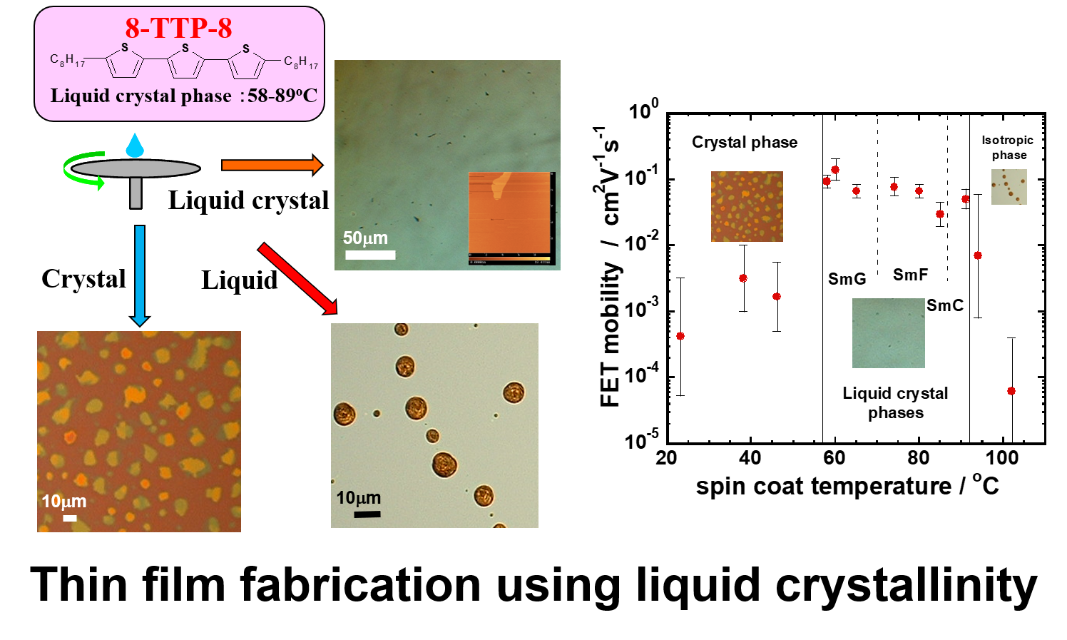 そこで、液晶性を利用することで、分子配向がそろい、平坦性が高く、結晶性も高い結晶薄膜を通常の溶液プロセス法で作製することができます。流動性を有する液晶薄膜を前駆状態として利用することで、分子レベルで平坦で結晶性の高い結晶薄膜を容易に製膜することができます。簡易な溶液プロセス法であるスピンコート法を用いて、ターチオフェン液晶やベンゾチエノベンゾチオフェン(BTBT)液晶の平坦な結晶薄膜が実現できます。
