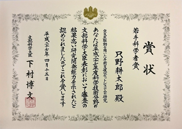 Top > News & Information > Assoc. Prof. Kotaro Tadano receives "Young Scientist Award" from Minister of Education, Culture, Sports, Science and Technology (April 15, 2015)